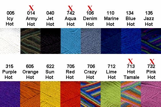 Limited to stock on hand Color #106 Denim Hot 7 balls; Color #742 Aqua Hot 7 balls; Color #135 Jazz Hot 4 balls; Color #732 Pink Hot 11 balls; Color #044 Steel Hot 8 balls; Color #014 Army Hot 5 balls; Color#712 Lime Hot 2 balls; Color #713 Hot Tamale 6 balls
